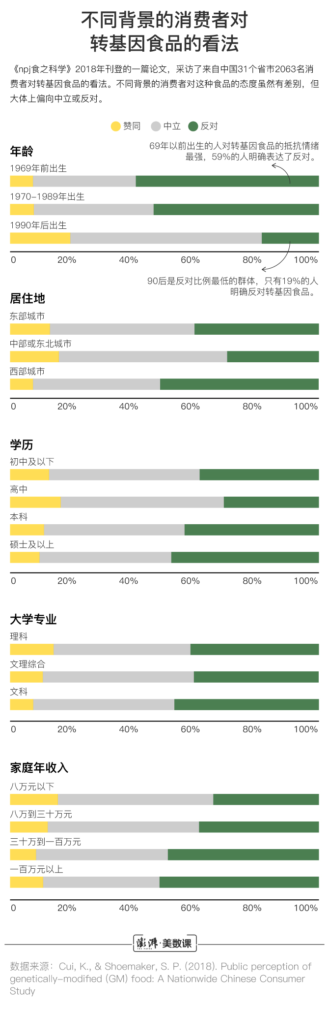 有趣的是,硕士及以上学历和年收入一百万元以上的受访者中,对转基因食品持抵触态度的比例并不小,分别是48%和52%。作者没有给出直接的解释。